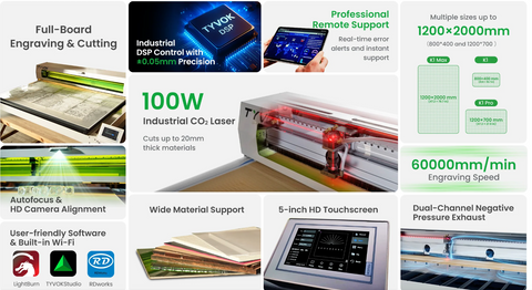 - 100W CO₂ Laser Engine — Cuts up to 20mm thick with ±0.05mm precision.